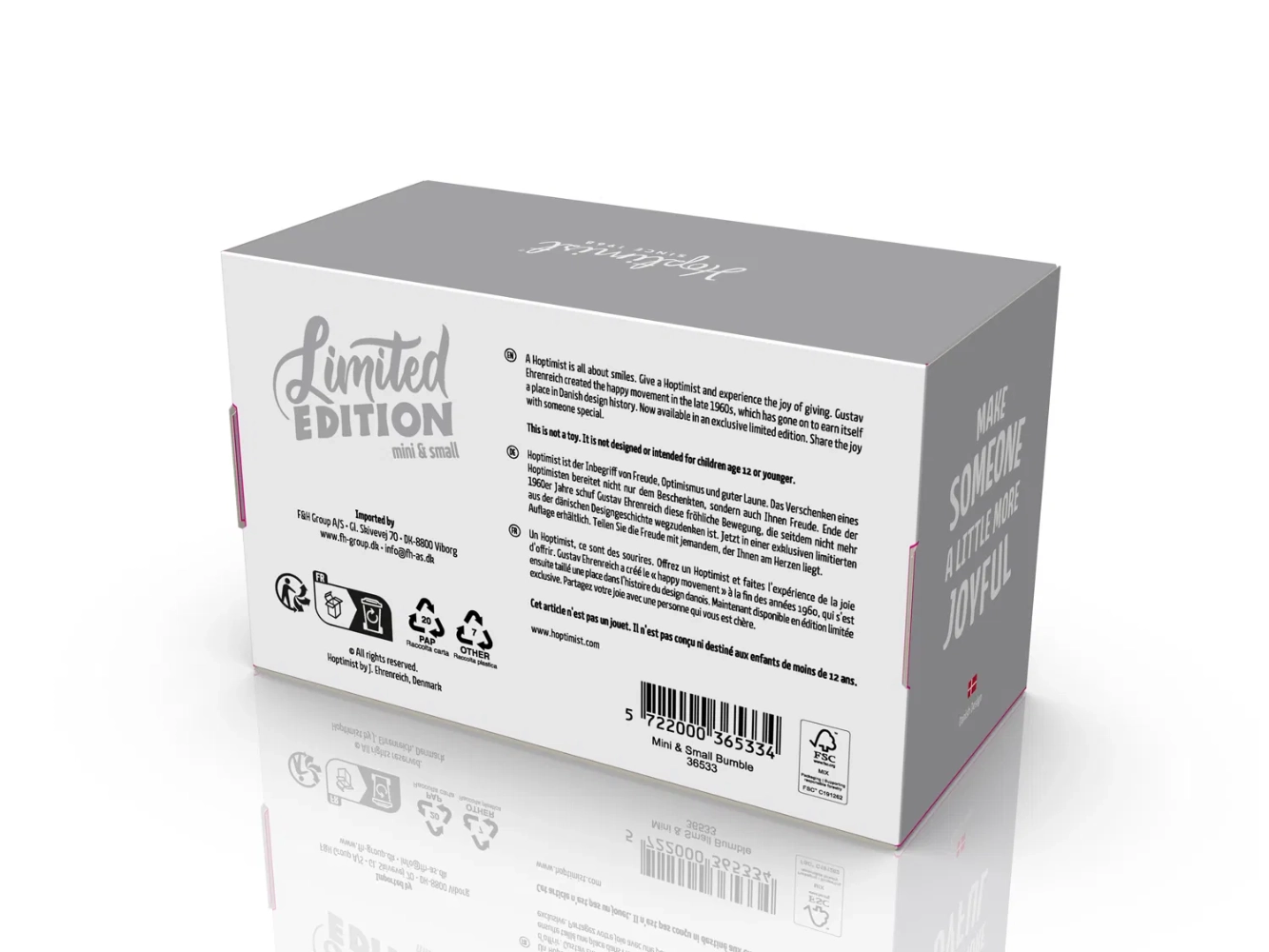 Avec une forte croyance dans le pouvoir des sourires, Gustav Ehrenreich a fondé son mouvement joyeux des Hoptimists à la fin des années 1960. Le but était de créer une figurine qui servirait de rappel constant à rester positif et optimiste. Car si les années 1960 sont souvent qualifiées de « Swinging Sixties », cette décennie était marquée par des troubles. Cela a fait du design d’Ehrenreich un répandeur de joie bienvenu dans une époque autrement turbulente. Bimble et Bumble représentent les tout premiers Hoptimists conçus par Ehrenreich : une fille aux yeux souriants portant une robe et un garçon vif et curieux avec une mèche sur la tête. Aujourd’hui, les joyeux Hoptimists font partie de l’histoire du design danois et suscitent de la joie dans le monde entier. Les figurines sont disponibles en quatre tailles différentes et dans une large gamme de couleurs qui diffusent beaucoup de jeu, de gaieté et de bonheur. Il existe un Hoptimist pour chaque occasion et pour chaque personne.