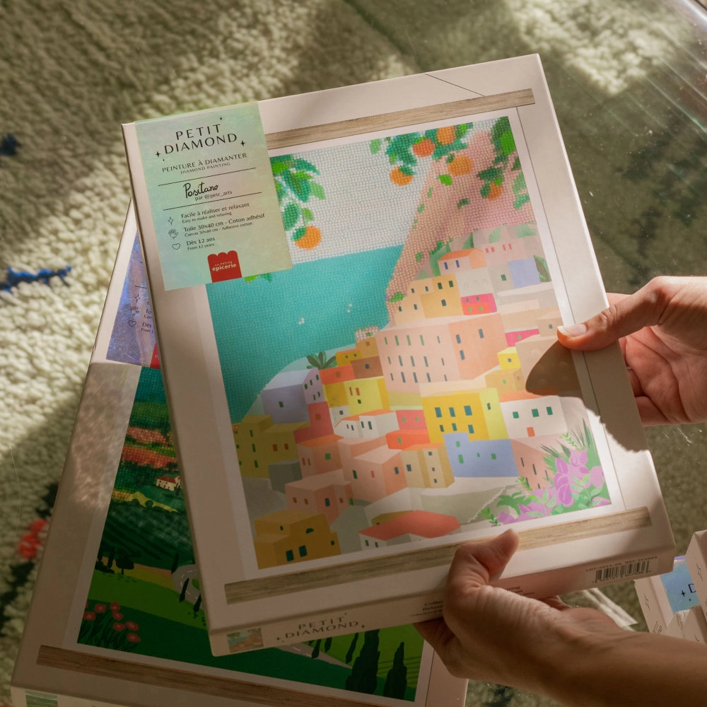 Le Petit Diamond Positano de La Petite Épicerie vous invite à découvrir la beauté intemporelle de la côte amalfitaine. Cette illustration lumineuse et détaillée capture l’essence de Positano, ce village perché sur une falaise, où les maisons colorées semblent s’accrocher à la roche, dominant une mer Méditerranée d’un bleu profond. Encadrée par de luxuriants orangers qui diffusent un parfum d’évasion, cette scène évoque des vacances en Italie, entre soleil éclatant et douceur de vivre. Une fois achevée, cette œuvre scintillante devient une pièce décorative élégante qui illumine votre intérieur d’une ambiance méditerranéenne.