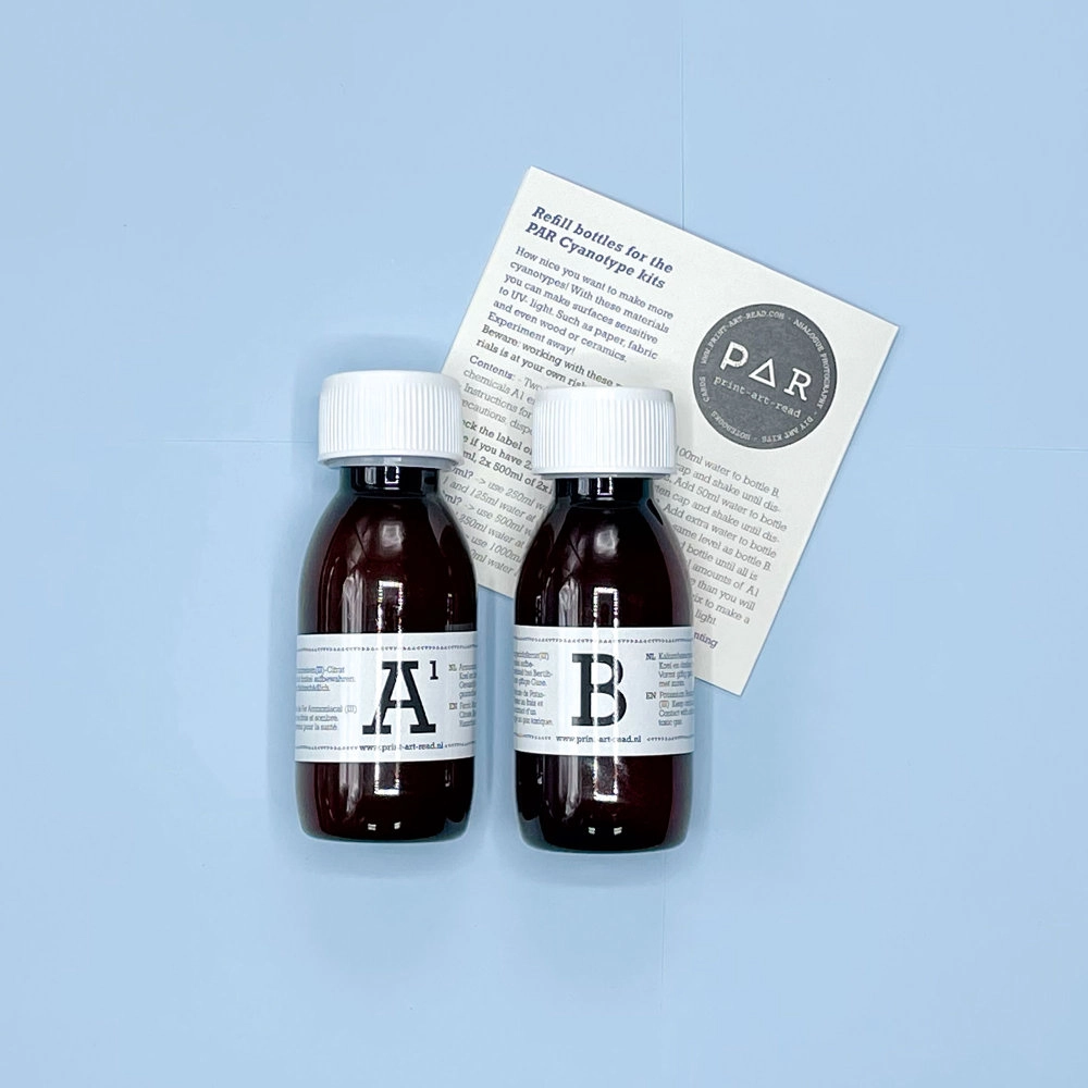 Kit de cyanotype DIY – Recharge Réalisez des cyanotypes grâce à un procédé photographique analogique. Déjà familiarisé avec le processus de cyanotypie, ou vous avez épuisé votre mélange de la première kit DIY ? Avec ce kit de recharge DIY Cyanotype, vous pouvez continuer vos créations ! Les recharges comprennent des instructions en néerlandais, anglais, français et allemand. 2 x 250 ml, pour un total de 500 ml de mélange final. La même quantité que dans le kit DIY Cyanotype – Textile de PAR Chaque recharge inclut une brève instruction pour mélanger les flacons, en supposant que vous ayez déjà les instructions détaillées du kit de démarrage ou une bonne connaissance du processus.