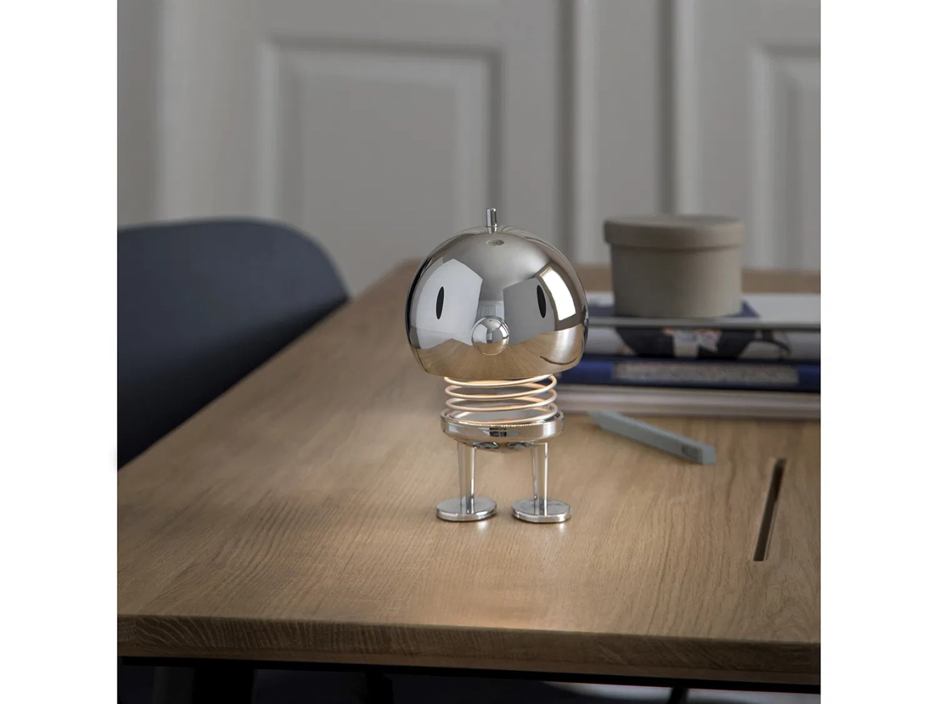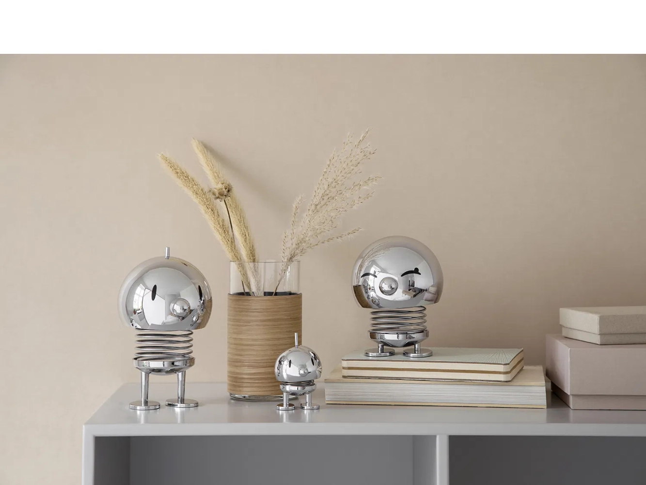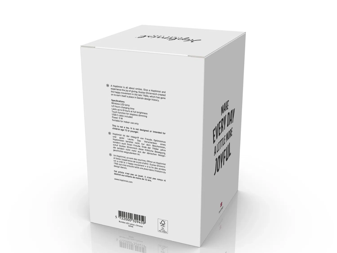 Laissez la magnifique lampe LED Hoptimist remplir votre pièce de lumière, de couleur et de convivialité, où que vous la placiez. Que vous la déplaciez sur votre bureau, dans votre coin préféré ou sur votre table de chevet, la lampe apportera de la joie à votre intérieur – sans le tracas des fils. La fonction tactile de la lampe permet d’allumer, d’éteindre et de régler la luminosité d’une simple touche. Une légère pression sur le dessus allume ou éteint la lumière, tandis qu’une pression prolongée ajuste la luminosité selon vos besoins. Après 4,5 heures de charge, la lampe est prête à diffuser de la joie pendant jusqu’à 8 heures, selon la luminosité choisie. Se recharge avec le câble USB-C fourni. H 15 cm, D 10 cm Caractéristiques Temps de charge : 4,5 heures Durée de fonctionnement : jusqu’à 8 heures Luminosité réglable Câble USB-C inclus Puissance : 5 W Avec une forte croyance dans le pouvoir des sourires, Gustav Ehrenreich a fondé son mouvement joyeux des Hoptimists à la fin des années 1960. Le but était de créer une figurine qui servirait de rappel constant à rester positif et optimiste. Car si les années 1960 sont souvent qualifiées de « Swinging Sixties », cette décennie était marquée par des troubles. Cela a fait du design d’Ehrenreich un répandeur de joie bienvenu dans une époque autrement turbulente. Bimble et Bumble représentent les tout premiers Hoptimists conçus par Ehrenreich : une fille aux yeux souriants portant une robe et un garçon vif et curieux avec une mèche sur la tête. Aujourd’hui, les joyeux Hoptimists font partie de l’histoire du design danois et suscitent de la joie dans le monde entier.