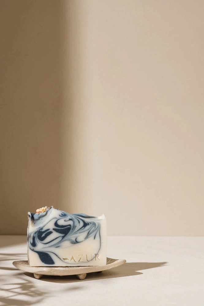 Ingrédients : Huile d'olive saponifiée, huile de coco saponifiée, beurre de cacao saponifié, huile d'amande douce saponifiée, eau, glycérine, beurre de karité saponifié, huile de ricin saponifiée, huile essentielle d'eucalyptus, huile essentielle de menthe, poudre de feuille d'indigo, argile kaolin, fleurs séchées de jasmin, feuilles séchées d'eucalyptus, graines de pavot.