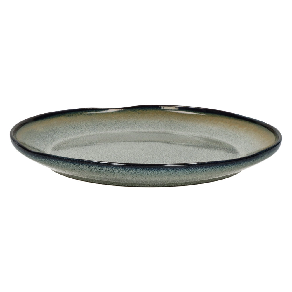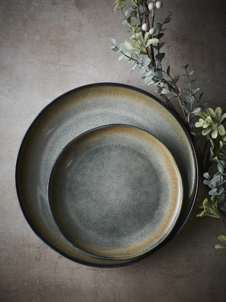 Cette vaisselle de huit pièces Nicky est fabriquée en grès, et dérive son caractère particulier de trois types différents d’émail réactif. Chaque pièce est d’abord revêtue d’une couleur de fond brun foncé, sur laquelle est superposée une teinte plus claire, bleu grisâtre. L’ensemble est ensuite complété par un bord bleu foncé, qui réagit avec les deux autres émaux, et donne au bord supérieur la palette de couleurs d’une belle soirée d’automne.