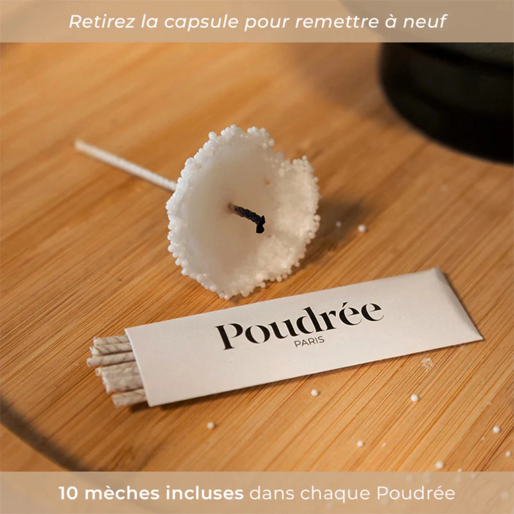 Avec ces 12 nouvelles éditions permanentes, redécouvrez notre concept de bougie en perles, cette fois déjà infusées de parfums inédits Poudrée Paris. 10 mèches incluses dans chaque Poudrée Cèdre du Liban : Cèdre virginie / Boisée / Musc 1. Choisissez un récipient Choisissez un récipient de votre choix, qu'il s'agisse d'un ancien contenant à bougie, d'un vase ou d'un contenant plus créatif. Versez délicatement les perles de cire dans le récipient jusqu'à la hauteur désirée. 2. Insérez la mèche et allumez Prenez une mèche (incluse) et insérez-la au centre des perles de cire. Assurez-vous que la mèche soit bien droite et qu'elle dépasse de 1cm des perles. Votre récipient doit faire au minimum 8cm de diamètre. 3. Remplacez la mèche Après usage, une capsule de cire se forme autour de la mèche de votre bougie Poudrée. Retirez ou retournez cette capsule pour révéler une nouvelle mèche toute neuve et profiter à nouveau de votre bougie !