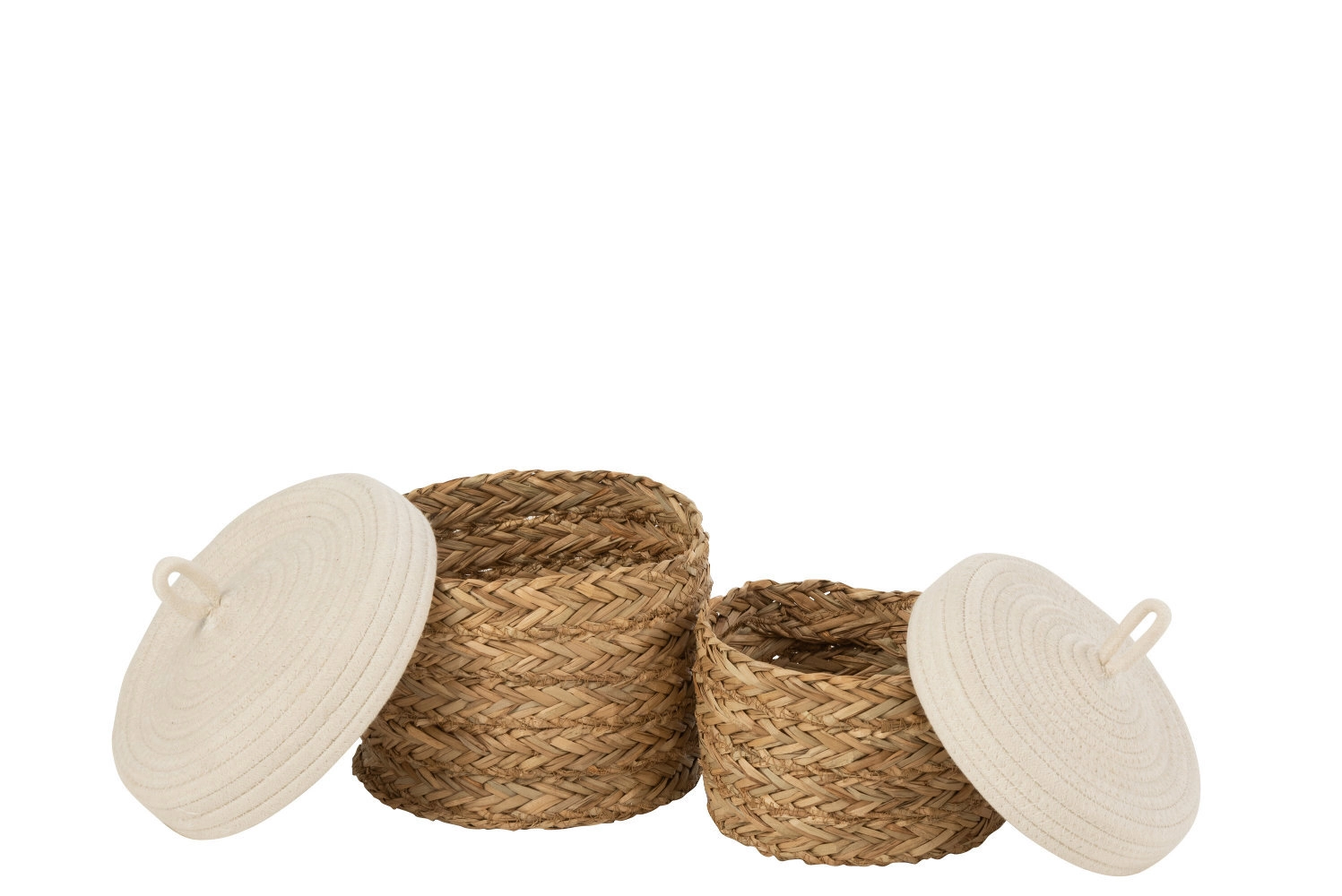 Set De 2 Paniers Ronds Avec Couvercle Coton/Rotin Naturel/Blanc