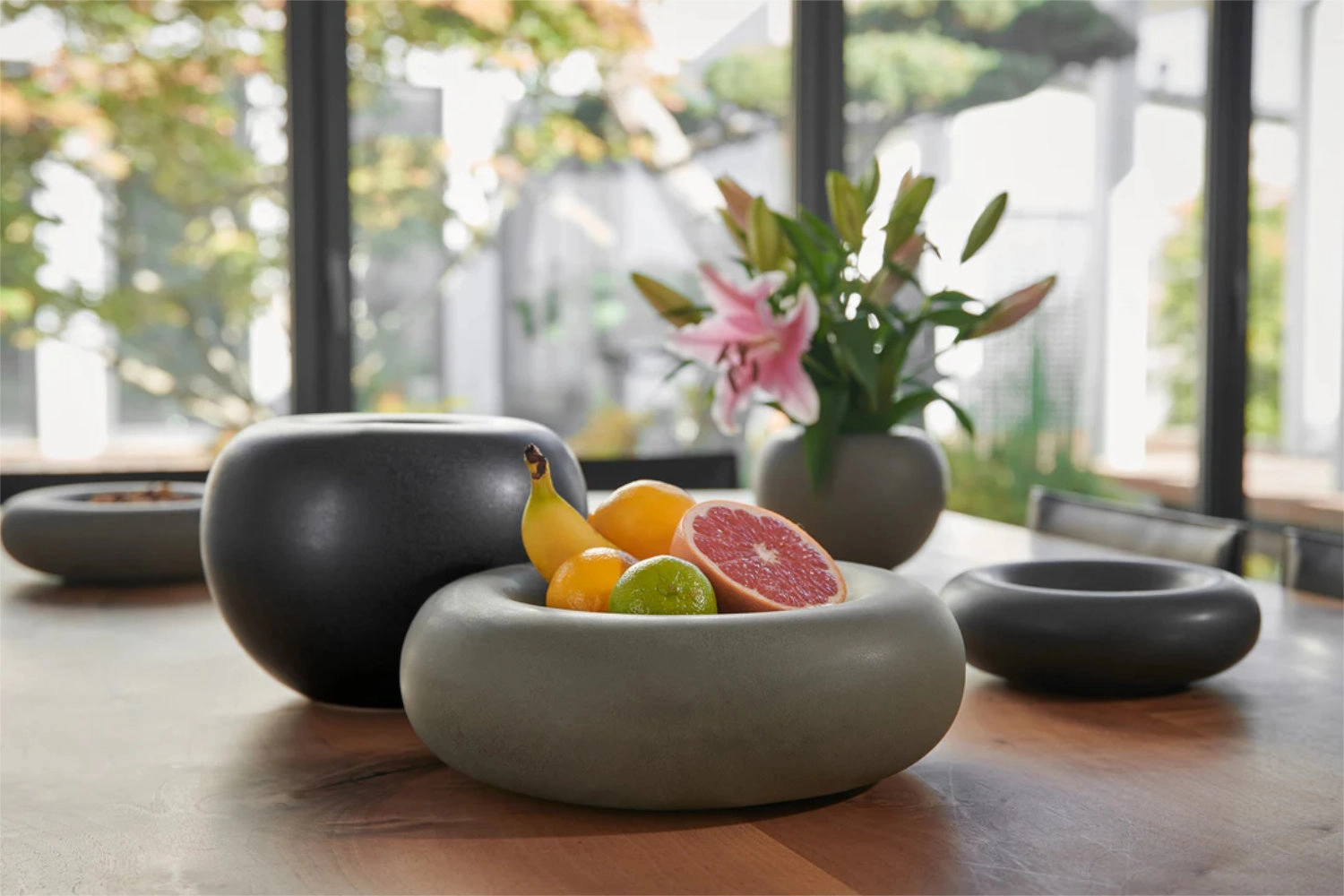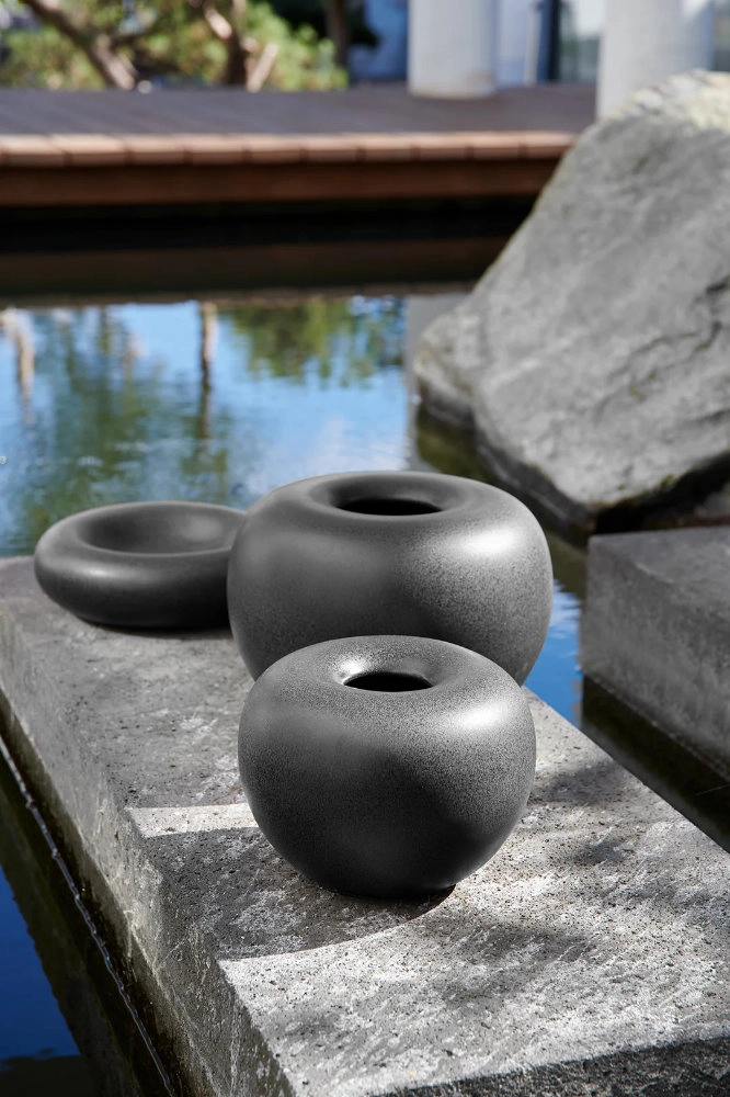 Les vases et coupes rappellent, par leurs formes, des galets polis par la force de l’eau. Les deux décors à glaçure réactive évoquent une esthétique brute et inspirée de la nature.